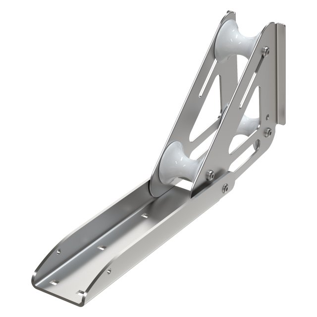 Stabilt och ledad ankarbeslag i polerat rostfritt stål, utformat för säker och smidig hantering av ankaret.